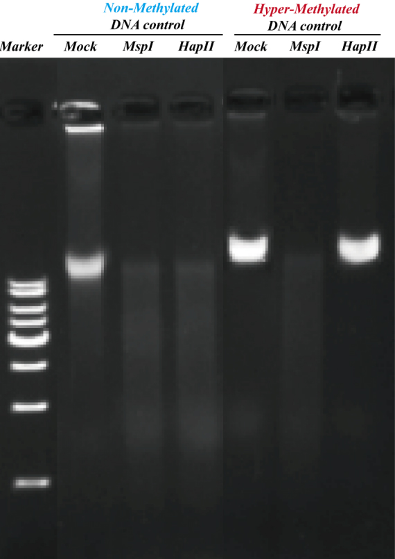 | 2. HpaII對(duì)CpG甲基化敏感,不能酶切甲基化的DNA,只能酶切非甲基化的DNA。 | ||||