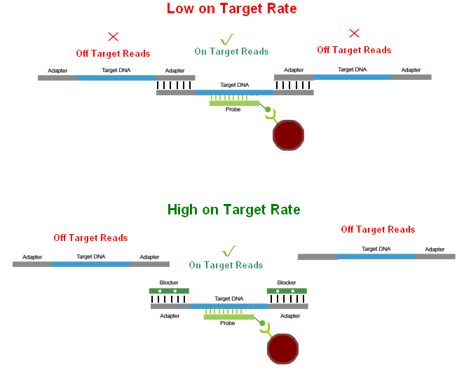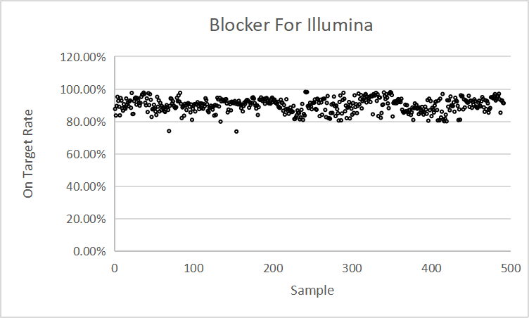 Universal Blocker for Illumina是針對(duì)Illumina 平臺(tái)普通DNA文庫(kù)開發(fā)的適用于液相雜交捕獲通用型接頭封阻序列,可有效減少雜交過(guò)程中因接頭之間退火而造成的不同文庫(kù)分子之間形成的串聯(lián)結(jié)構(gòu),從而降低非特異性雜交。 適用于Illumina Truseq測(cè)序平臺(tái)的液相雜交捕獲通用封阻斷序列。 適用于6 - 10 bp Index Barcode。 適用于含UMI序列的接頭文庫(kù)。 顯著降低接頭之間的非特異性結(jié)合,提高中靶率和富集程度。 在相同測(cè)序數(shù)據(jù)量情況下,顯著提升有效測(cè)序深度。