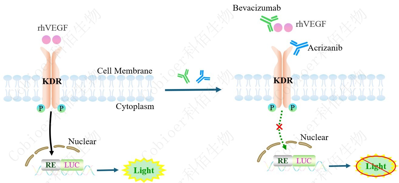 VEGF(KDR) Effector Reporter Cell 報告基因藥靶模型很好的模擬了體內(nèi) VEGF(KDR)的信號轉(zhuǎn)導(dǎo)過程,原理見下圖所示。