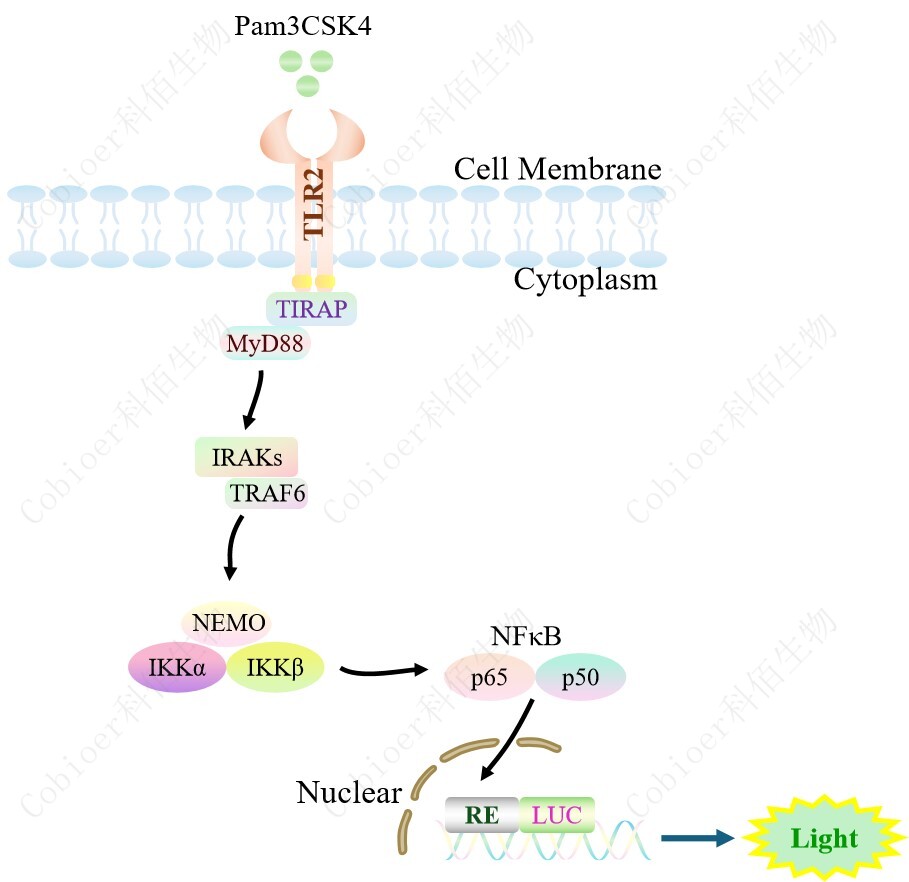 TLR2 NFκB-Luc HEK293 報告基因藥靶模型很好的模擬了體內(nèi) TLR2 的信號轉(zhuǎn)導過程, 原理見下圖所示。