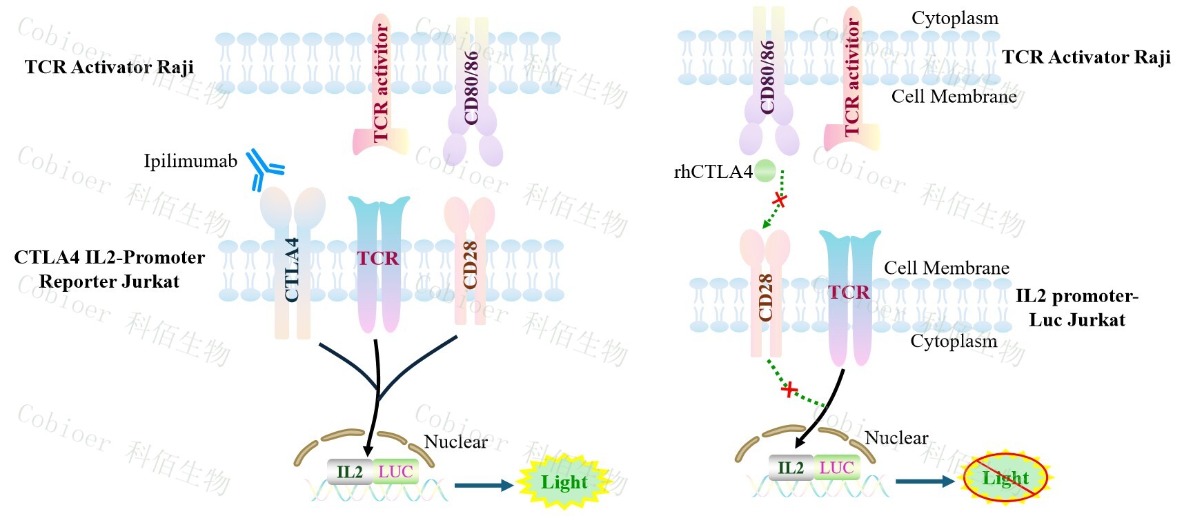 TCR Activator Raji 報(bào)告基因藥靶模型很好的模擬了體內(nèi) CD28&CD80/CD86 或者CTLA4 的信號(hào)轉(zhuǎn)導(dǎo)過(guò)程,原理見(jiàn)下圖所示。![]() Figure 1. TCR Activator Raji 細(xì)胞模型原理圖 |