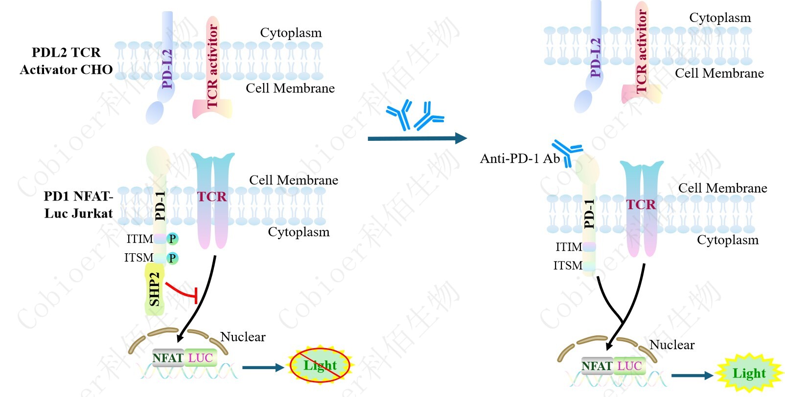 PDL2 TCR Activator CHO 細胞作為 PD1 NFAT-Luc Jurkat 細胞的靶細胞,很好的模擬了體內 PD1&PDL2 的信號轉導過程,原理見下圖所示。![]() Figure 1. PDL2 TCR Activator CHO 細胞模型原理圖