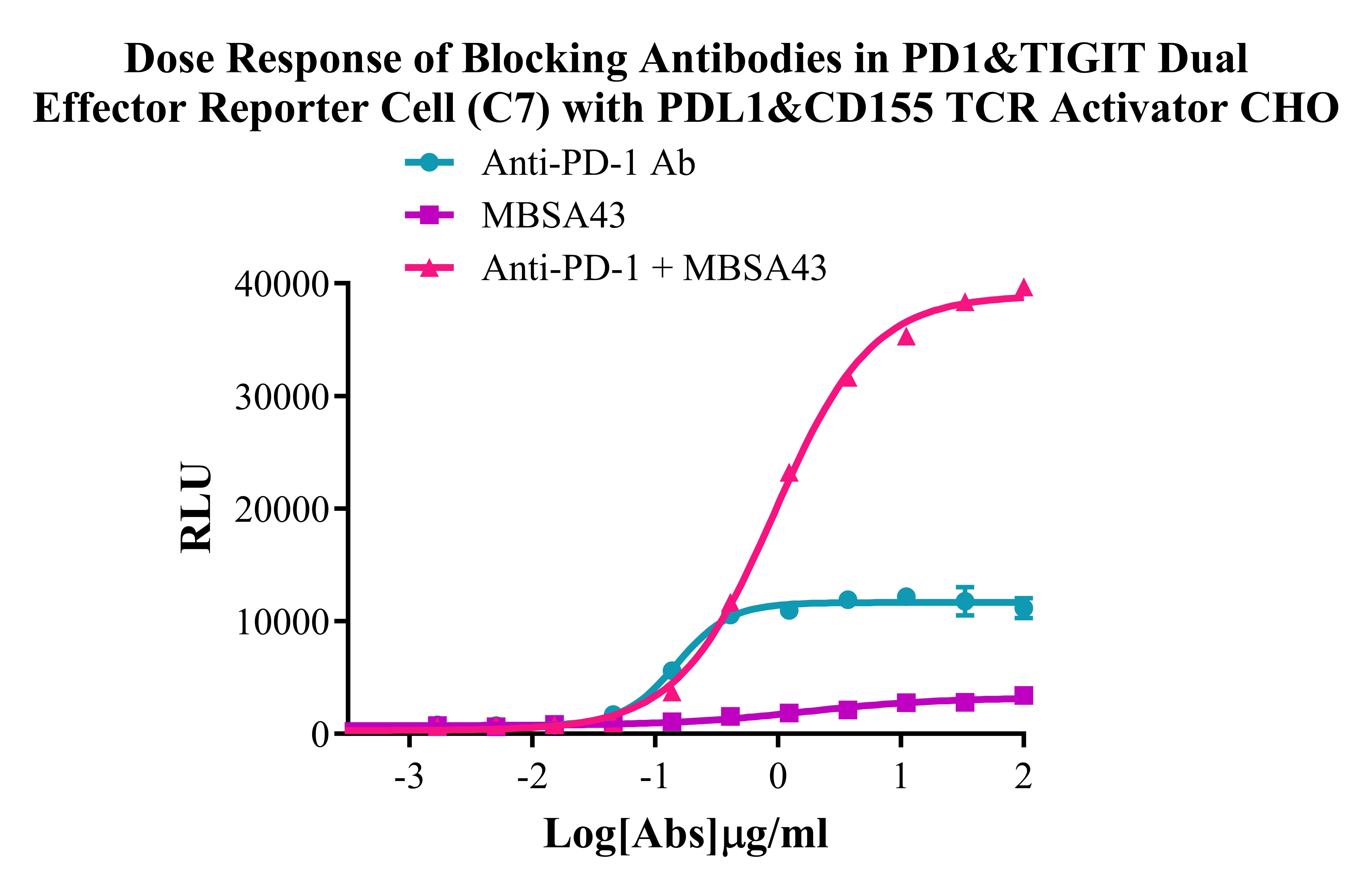 Figure 2. Dose Response of Blocking Antibodies in PD1&TIGIT Dual Effector Reporter Cell (C7) with PDL1&CD155 TCR Activator CHO.
