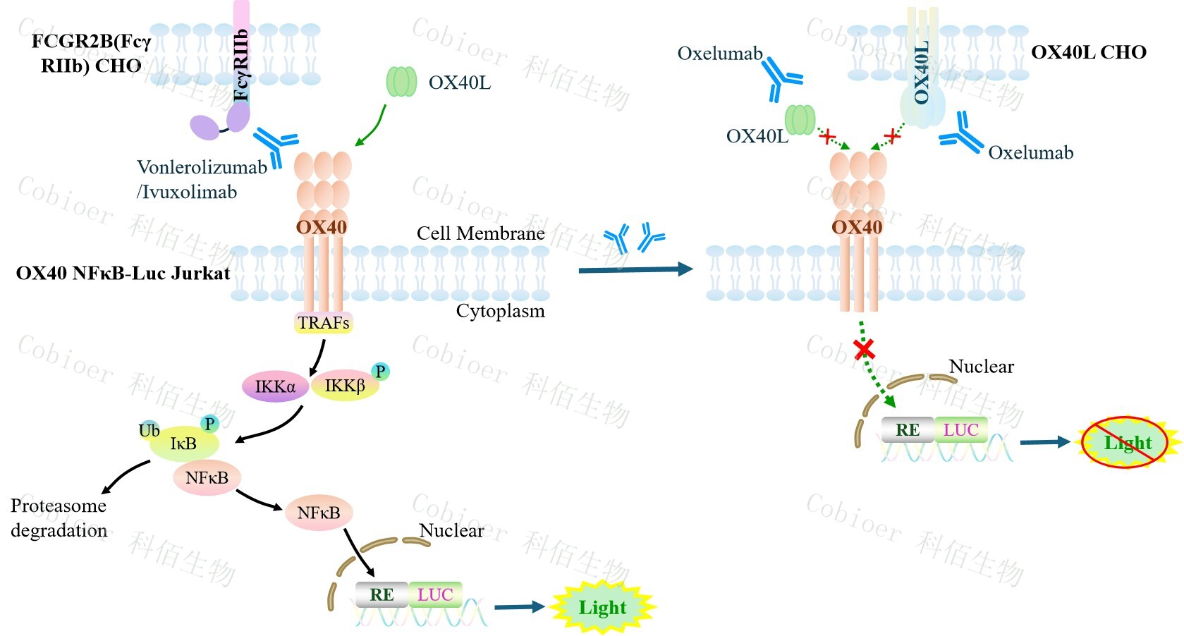 OX40 NFκB-Luc Jurkat 報(bào)告基因藥靶模型很好的模擬了體內(nèi) OX40 的信號(hào)轉(zhuǎn)導(dǎo)過(guò)程,原理見(jiàn)下圖所示。