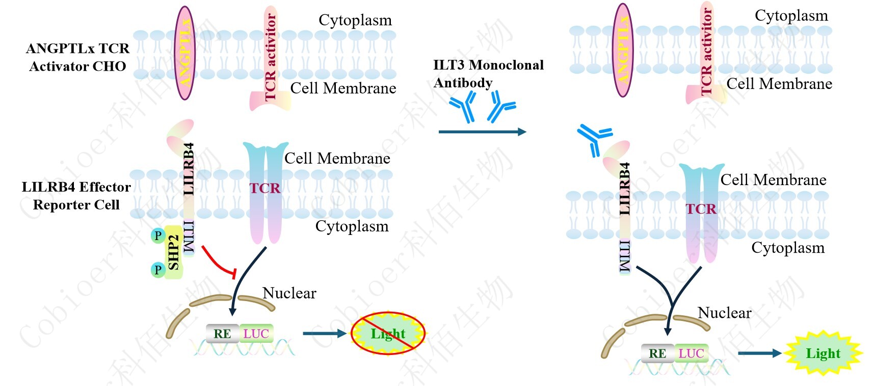 ANGPTLx TCR Activator CHO 作為 LILRB4 Effector Reporter Cell 的靶細胞,很好的模 擬了體內 LILRB4 的信號轉導過程,原理見下圖所示。![]() Figure 1. ANGPTLx TCR Activator CHO 模型原理圖 |