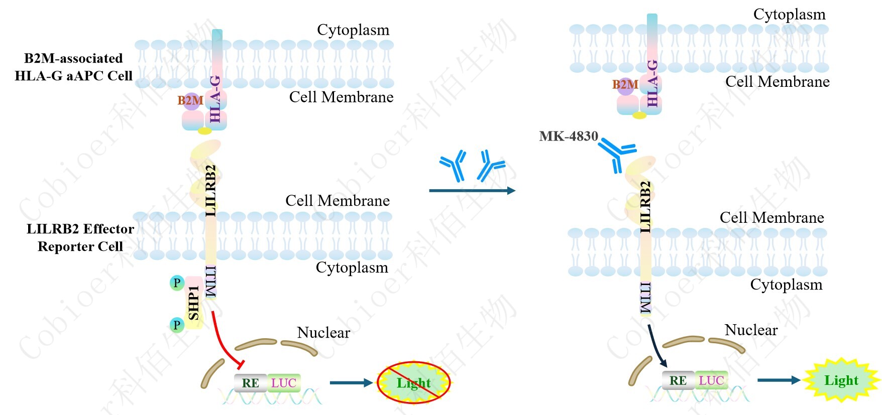 LILRB2 Effector Reporter Cell 報告基因藥靶模型很好的模擬了體內(nèi) LILRB2 的信號轉(zhuǎn)導(dǎo)過程,原理見下圖所示。![]() ![]() Figure 1. LILRB2 Effector Reporter Cell 模型原理圖 |