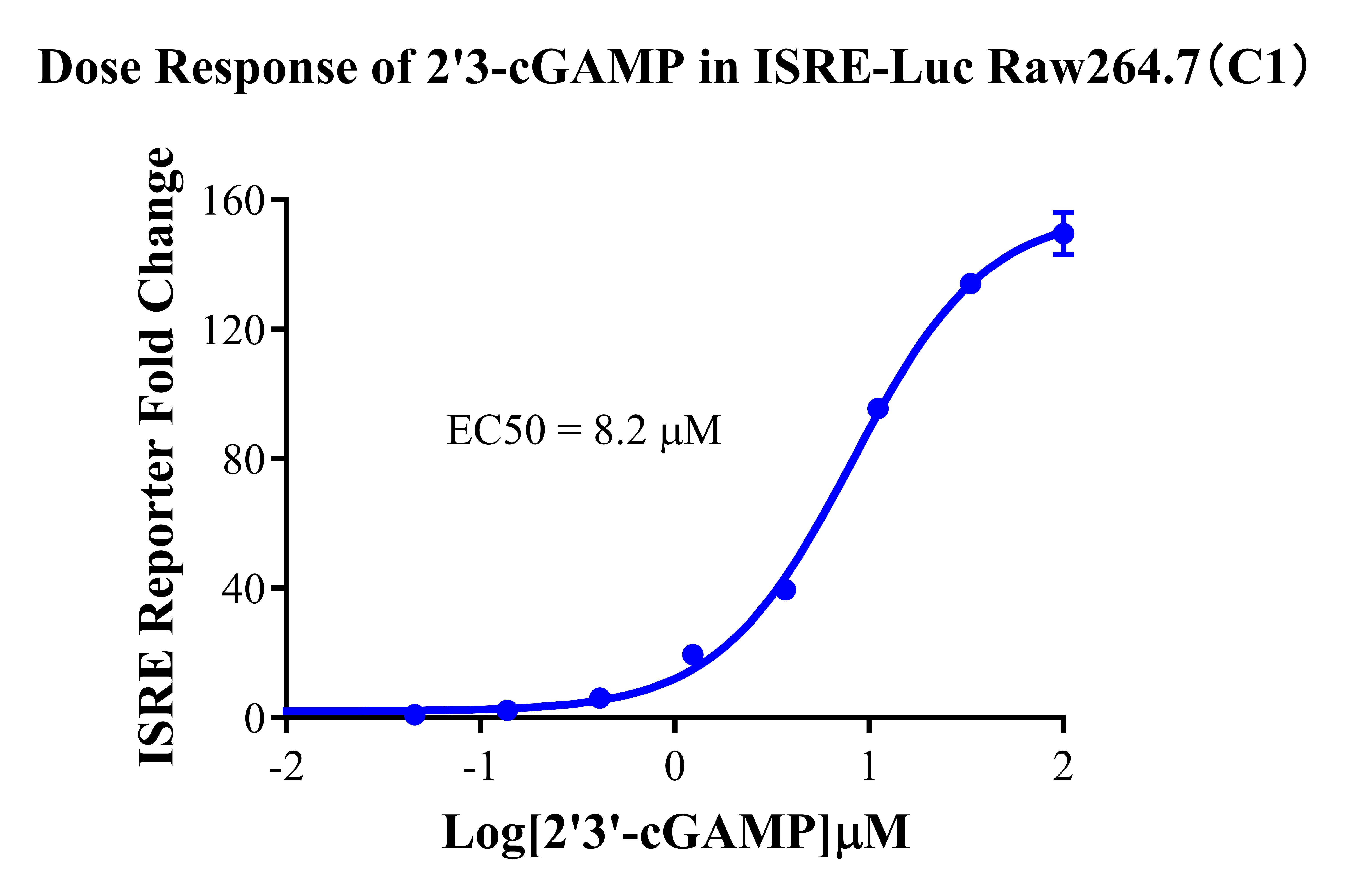 Figure 2. Detect Luciferase assay by Ultra Luciferase Detection Kit CBPH0001(we strongly suggest to purchase from Cobioer). Dose Response of 2'3-cGAMP in ISRE-Luc RAW264.7(C1). |