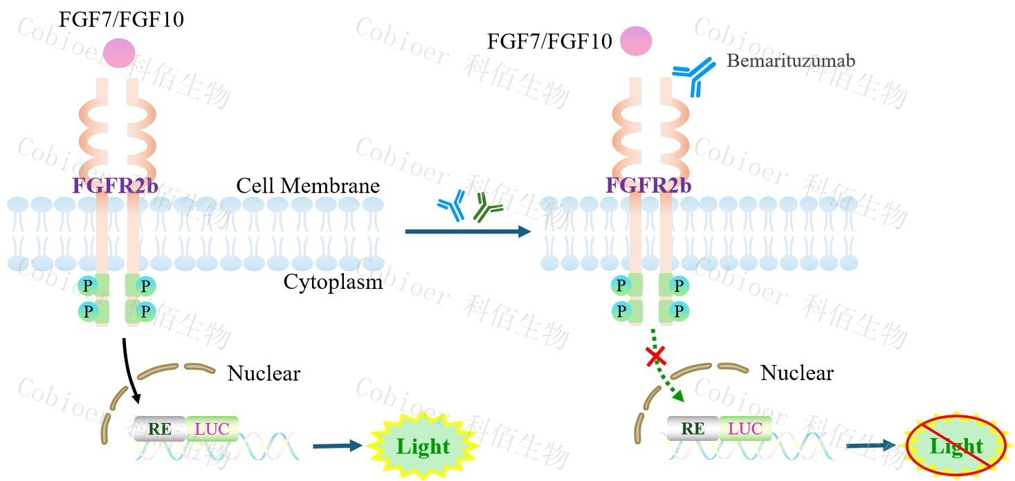 FGFR2b Effector Reporter Cell 報告基因藥靶模型很好的模擬了體內(nèi) FGFR2b 的信號轉(zhuǎn) 導(dǎo)過程,原理見圖 所示。![]() Figure 1. FGFR2b Effector Reporter Cell 細胞模型原理圖 |