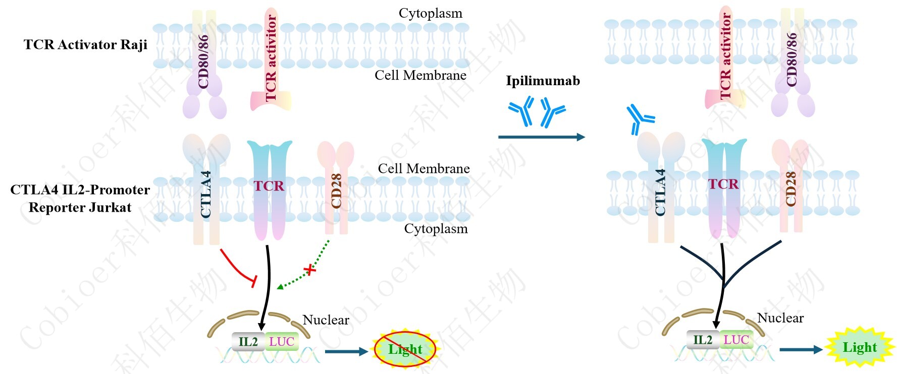 CTLA4 IL2-Promoter Reporter Jurkat 報告基因藥靶模型很好的模擬了體內(nèi) CTLA4&IL2 的信號轉(zhuǎn)導(dǎo)過程,原理見下圖所示。![]() Figure 1. CTLA4 IL2-Promoter Reporter Jurkat 細(xì)胞模型原理圖 |