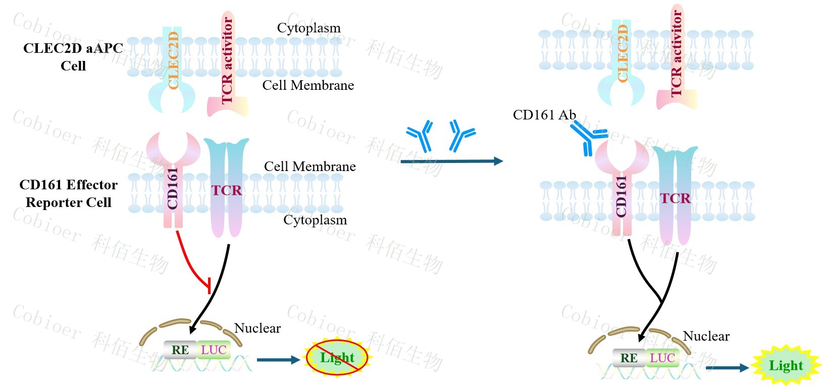 CLEC2D aAPC Cell 報告基因藥靶模型很好的模擬了體內(nèi) CD161/CLEC2D 的信號轉(zhuǎn)導(dǎo)過程,原理見下圖所示。![]() Figure 1. CLEC2D aAPC Cell 細胞模型原理圖 |