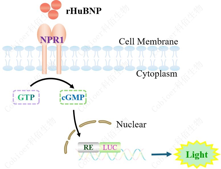 BNP/NPR1 Effector Reporter Cell 報告基因藥靶模型很好的模擬了體內(nèi) NPR1 的信號轉(zhuǎn)導(dǎo)過程,原理見下圖所示。![]() Figure 1. BNP/NPR1 Effector Reporter Cell 細胞模型原理圖 |