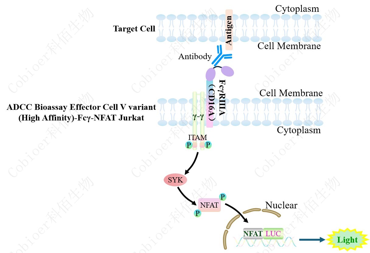 ADCC Bioassay Effector Cell V variant (High Affinity)-Fcγ-NFAT Jurkat 報(bào)告基因藥靶模 型很好的模擬了體內(nèi) ADCC 的信號(hào)轉(zhuǎn)導(dǎo)過(guò)程,原理見下圖所示。