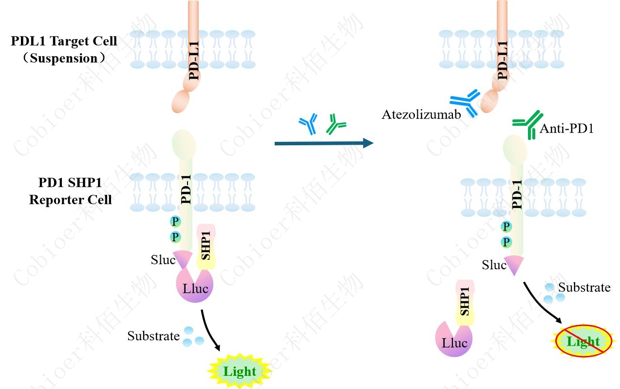 PD1 SHP1 Reporter Cell 報(bào)告基因藥靶模型很好的模擬了體內(nèi) PD1/SHP1 的信號(hào)轉(zhuǎn)導(dǎo)過(guò) 程,原理見(jiàn)下圖所示。![]() Figure 1. PD1 SHP1 Reporter Cell 細(xì)胞模型原理圖 |