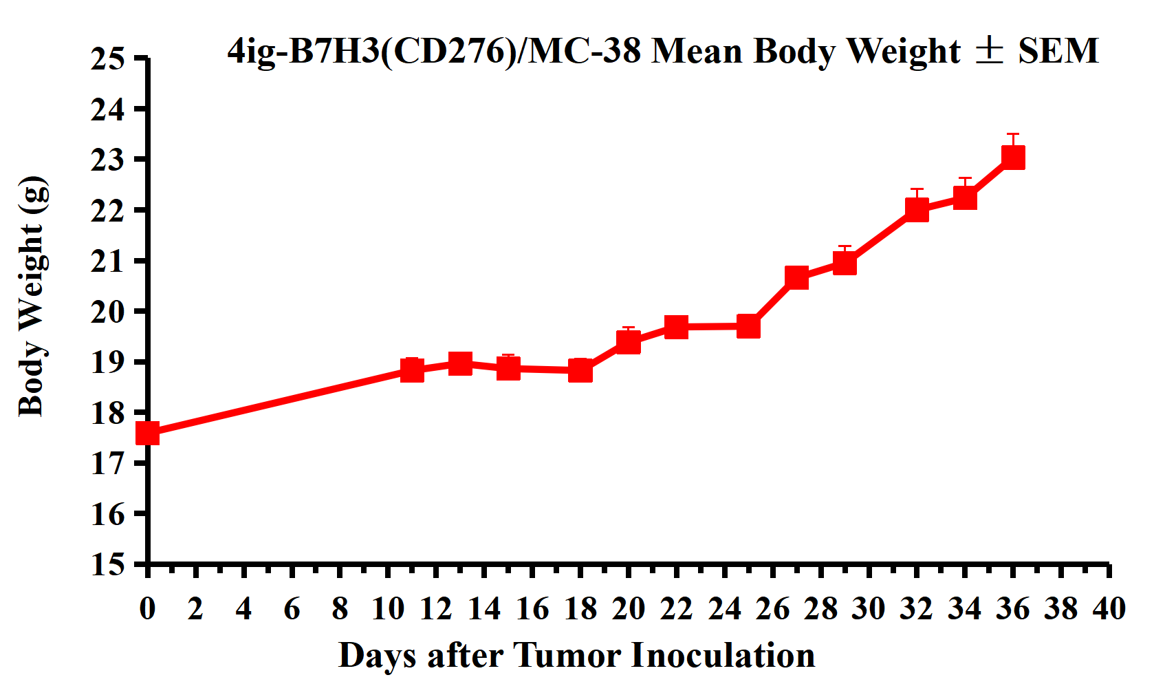 Figure 2. 4ig-B7H3(CD276)/MC-38 Mean Body Weight ± SEM.