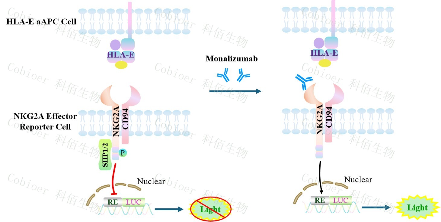 HLA-E aAPC Cell 作為 NKG2A Effector Reporter Cell 的靶細胞,很好的模擬了體內 NKG2A &HLA-E 的信號轉導過程,原理見下圖所示。 ![]() Figure 1. HLA-E aAPC Cell 細胞模型原理圖 |