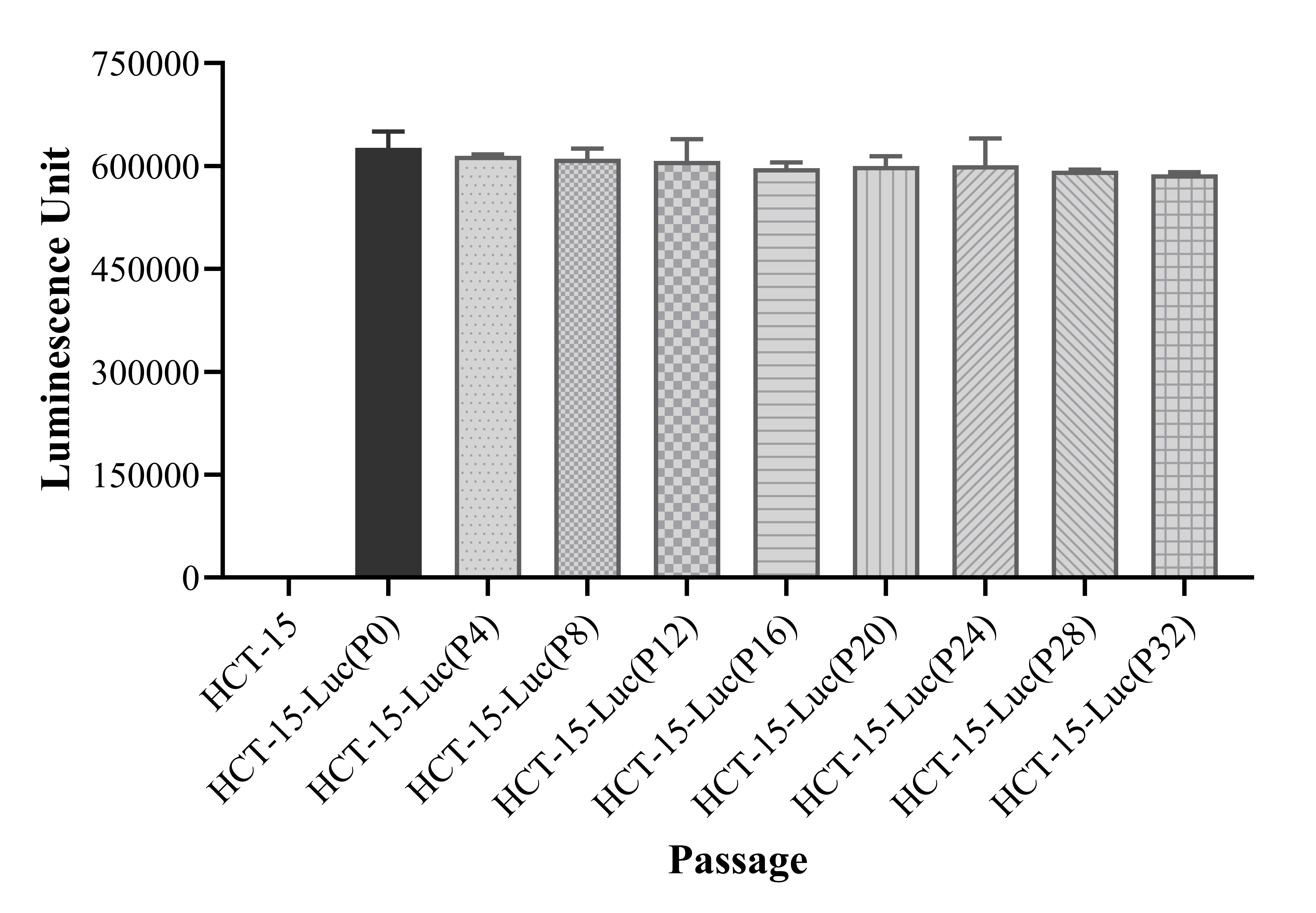 Figure 1. Stablity test results. HCT-15-Luc showed at least 32 passage stability with similar luminescence unit. |
