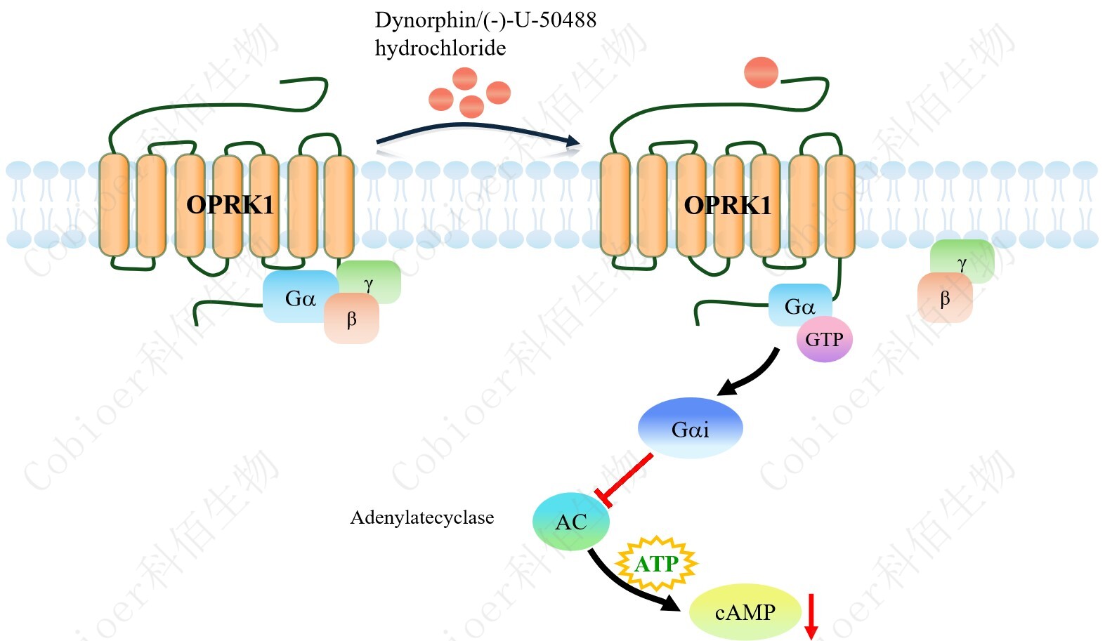 cAMP 在 G 蛋白偶聯(lián)受體(GPCR)信號(hào)轉(zhuǎn)導(dǎo)中是一種關(guān)鍵的第二信使。當(dāng)配體結(jié)合到 GPCR,構(gòu)象發(fā)生變化,激活受體接著激活 G 蛋白,Gi 的激活導(dǎo)致腺苷酸環(huán)化酶調(diào)控 cAMP 的下調(diào)。OPRK1 CHO 藥靶模型很好的模擬了體內(nèi) OPRK1 的信號(hào)轉(zhuǎn)導(dǎo)過(guò)程,原理見(jiàn)下圖 所示。 |