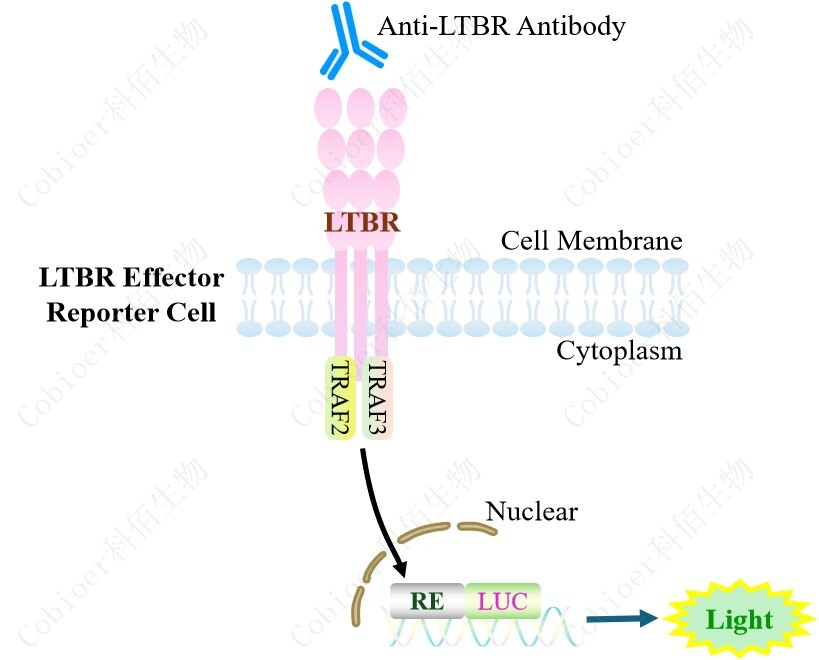 LTBR Effector Reporter Cell 報告基因藥靶模型很好的模擬了體內(nèi) LTBR 的信號轉導過 程, 原理見下圖所示。