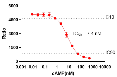 測試標(biāo)準(zhǔn)品的反應(yīng)曲線,以確定實(shí)驗(yàn)室中Stimulation Buffer或者細(xì)胞培養(yǎng)基的檢測線性動態(tài)范圍。這還將驗(yàn)證實(shí)驗(yàn)中是否產(chǎn)生了預(yù)期的 S/B 和 cAMP的IC50值。 特別是IC10 和 IC90的數(shù)值將在實(shí)驗(yàn)中非常有用,可以用于優(yōu)化細(xì)胞系的細(xì)胞密度。