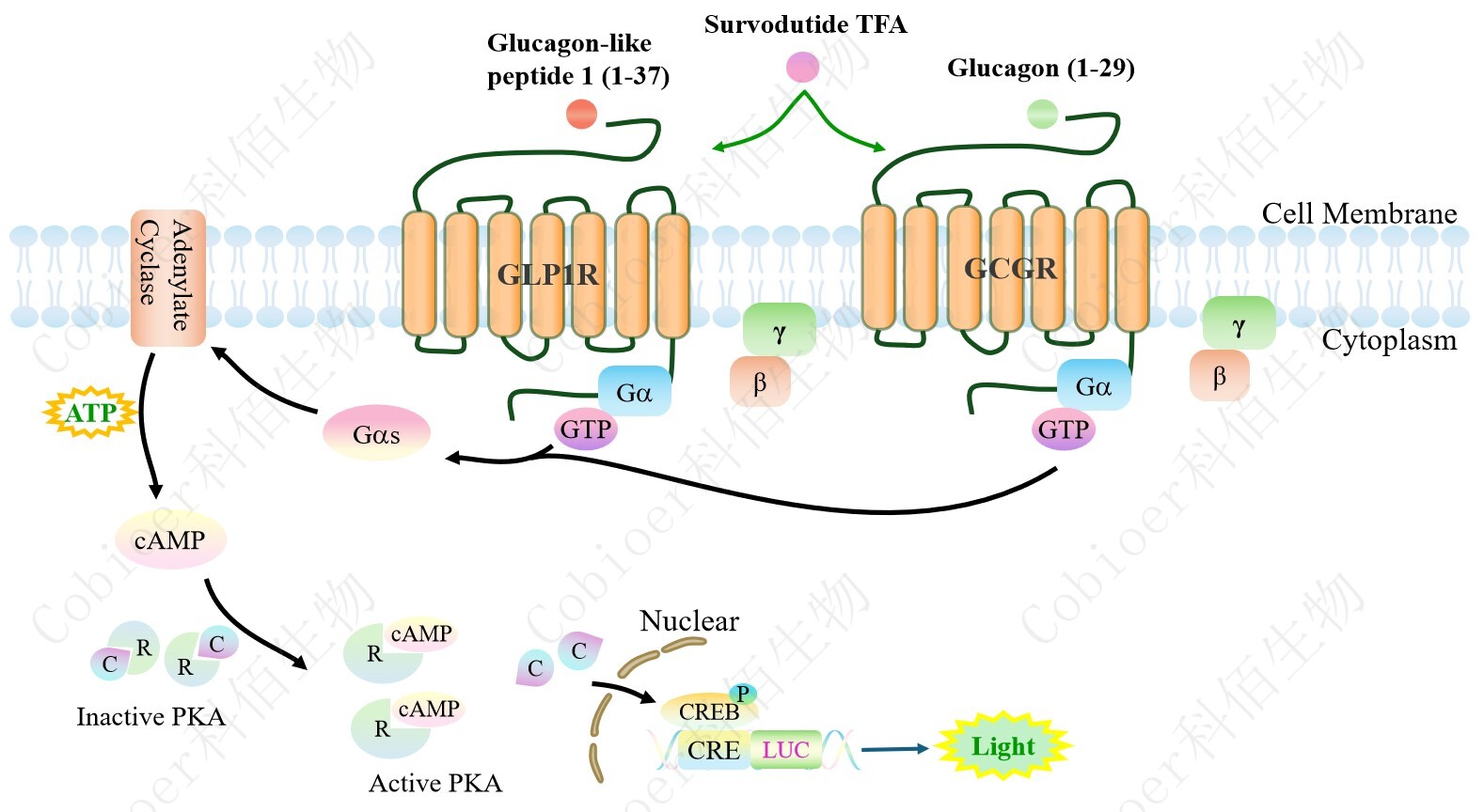 GLP1R&GCGR Dual Reporter Cell 報告基因藥靶模型很好的模擬了體內(nèi) GLP1R&GCGR 的信號轉(zhuǎn)導(dǎo)過程,原理見圖 1 所示。