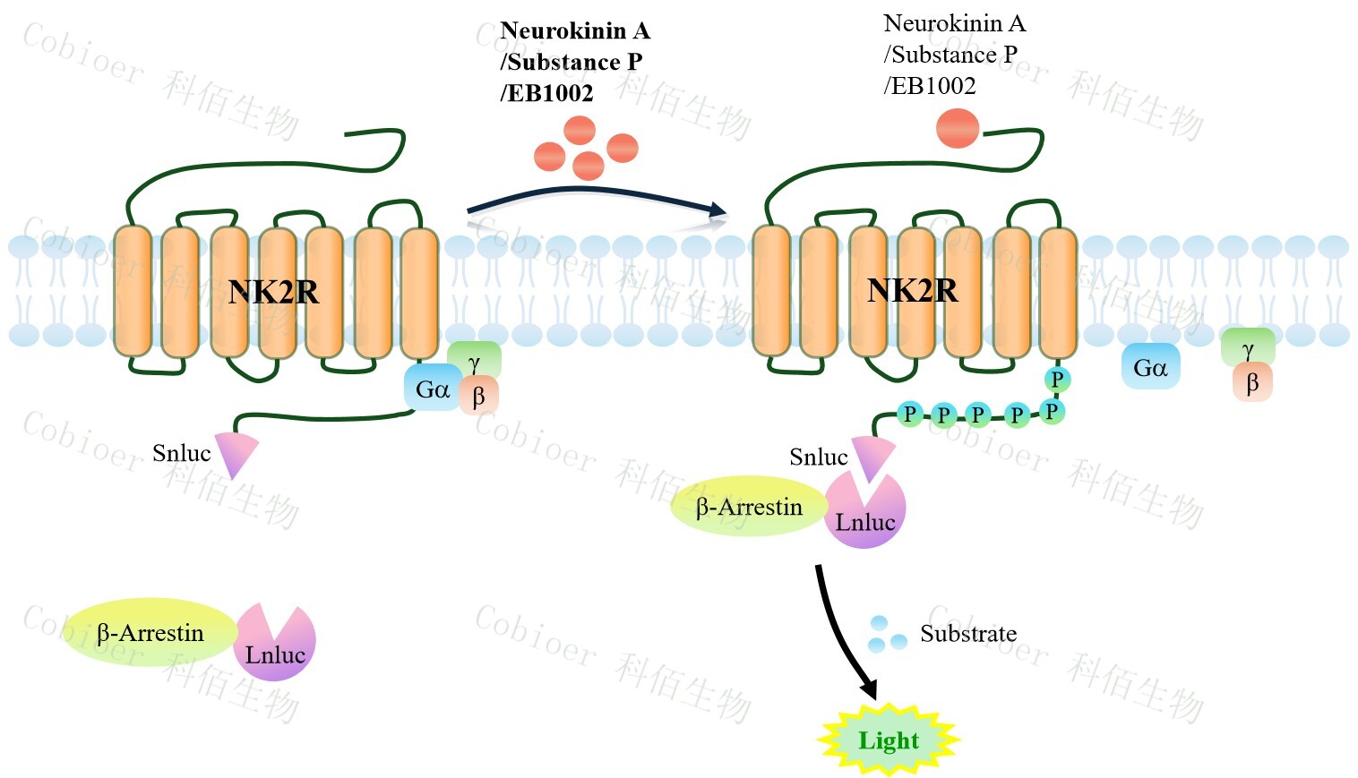 NK2R β-Arrestin CHO 報(bào)告基因藥靶模型很好的模擬了體內(nèi) NK2R/β-Arrestin 的信號轉(zhuǎn) 導(dǎo)過程,原理見下圖所示。當(dāng)缺乏配體刺激時(shí),β-Arrestin 不與 NK2R 結(jié)合,融合β-Arrestin 的熒光素酶處于失活構(gòu)象,當(dāng) NK2R 遭遇配體刺激時(shí),融合熒光素酶報(bào)告基因的β-Arrestin 被招募,使熒光素酶報(bào)告基因處于激活狀態(tài),加入其底物后發(fā)光信號增強(qiáng)。
