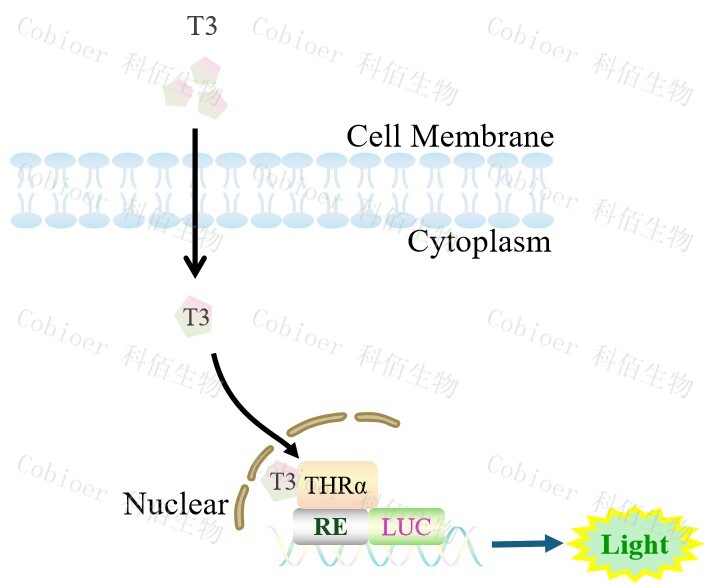 THRA Luciferase Reporter HEK293,是由 THRA 調(diào)控并表達(dá) Luc 熒光素 酶報(bào)告基因的 HEK293 細(xì)胞。甲狀腺激素(T3/T4)是一種有效的甲狀腺激素,主要通過結(jié) 合 TRs 發(fā)揮作用,調(diào)控基因表達(dá)和細(xì)胞功能,原理見下圖所示。 ![]() Figure 1. THRA Luciferase Reporter HEK293 原理示意圖