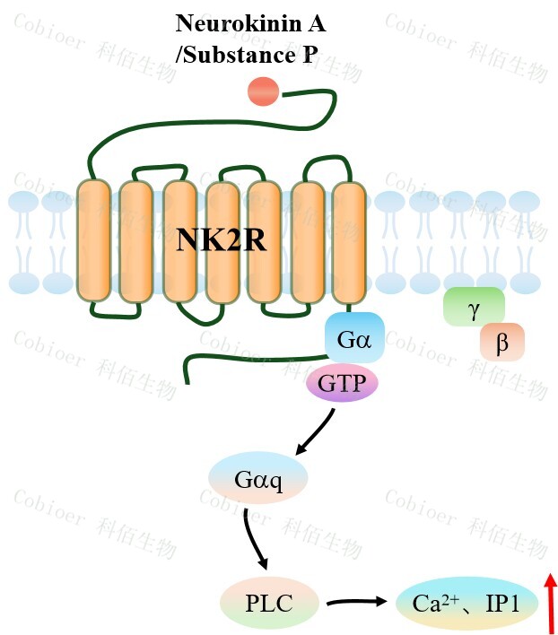 | 速激肽(Tachykinins )是分布在哺乳動(dòng)物中樞和周圍神經(jīng)系統(tǒng)中的一類神經(jīng)肽。速激 肽物質(zhì) P(SP)、神經(jīng)激肽 A(NKA)和神經(jīng)激肽 B(NKB)共享一個(gè)保守的 C 端基序, 對速激肽受體(NK1R、NK2R 和 NK3R)的激活至關(guān)重要。NKA 優(yōu)先激活與 Gα偶聯(lián)的 NK2R,而 SP 和 NKB 分別優(yōu)先結(jié)合 NK1R 和 NK3R。三種速激肽都能夠在所有速激肽受 體類型中表現(xiàn)為完全激動(dòng)劑。 NK2R 是一種 GPCR,普遍存在于中樞和周圍神經(jīng)系統(tǒng),然而,有研究發(fā)現(xiàn),NK2R 與 血紅蛋白 A1c(HbA1c)水平顯著相關(guān)。HbA1c 是評估長期血糖控制的重要指標(biāo),表明 NK2R 可能在糖代謝調(diào)控中發(fā)揮關(guān)鍵作用。 | |