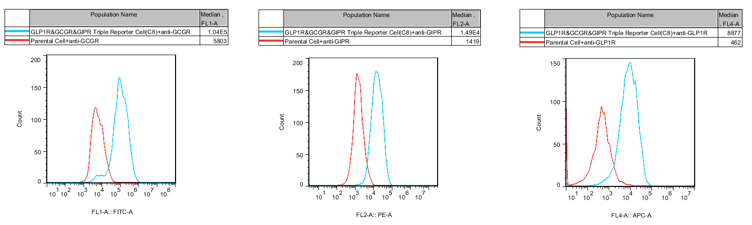 IV. Representative Data![]() Figure 2. Recombinant GLP1R&GCGR&GIPR Triple Reporter Cell stably expressing GLP1R&GCGR&GIPR. ![]() Figure 3. Dose Response of Agonists in GLP1R&GCGR&GIPR Triple Reporter Cell(C8. |
