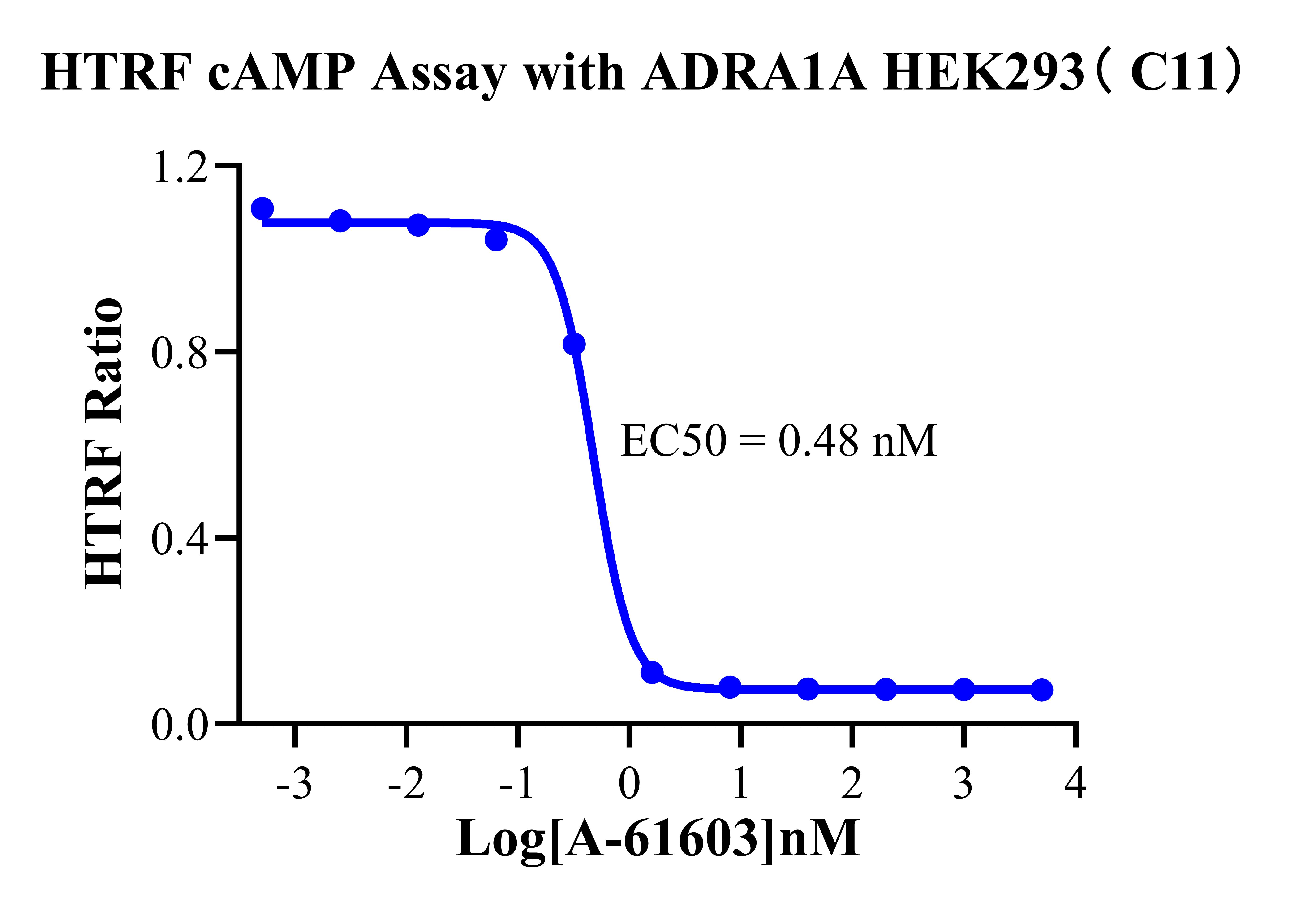 ADRA1A 還可以通過(guò) Gq 蛋白的信號(hào)通路,調(diào)控 IP1 的升高。ADRA1A 與配體結(jié)合, 導(dǎo)致 Gαq 亞基的激活,觸發(fā) PLC-γ,從而產(chǎn)生兩個(gè)第二信使:IP3 和 DAG,它們參與細(xì)胞 內(nèi)鈣動(dòng)員。由于 IP3 在代謝上不穩(wěn)定,因此測(cè)量通路激活的替代標(biāo)志物 IP1 作為檢測(cè)標(biāo)準(zhǔn)。