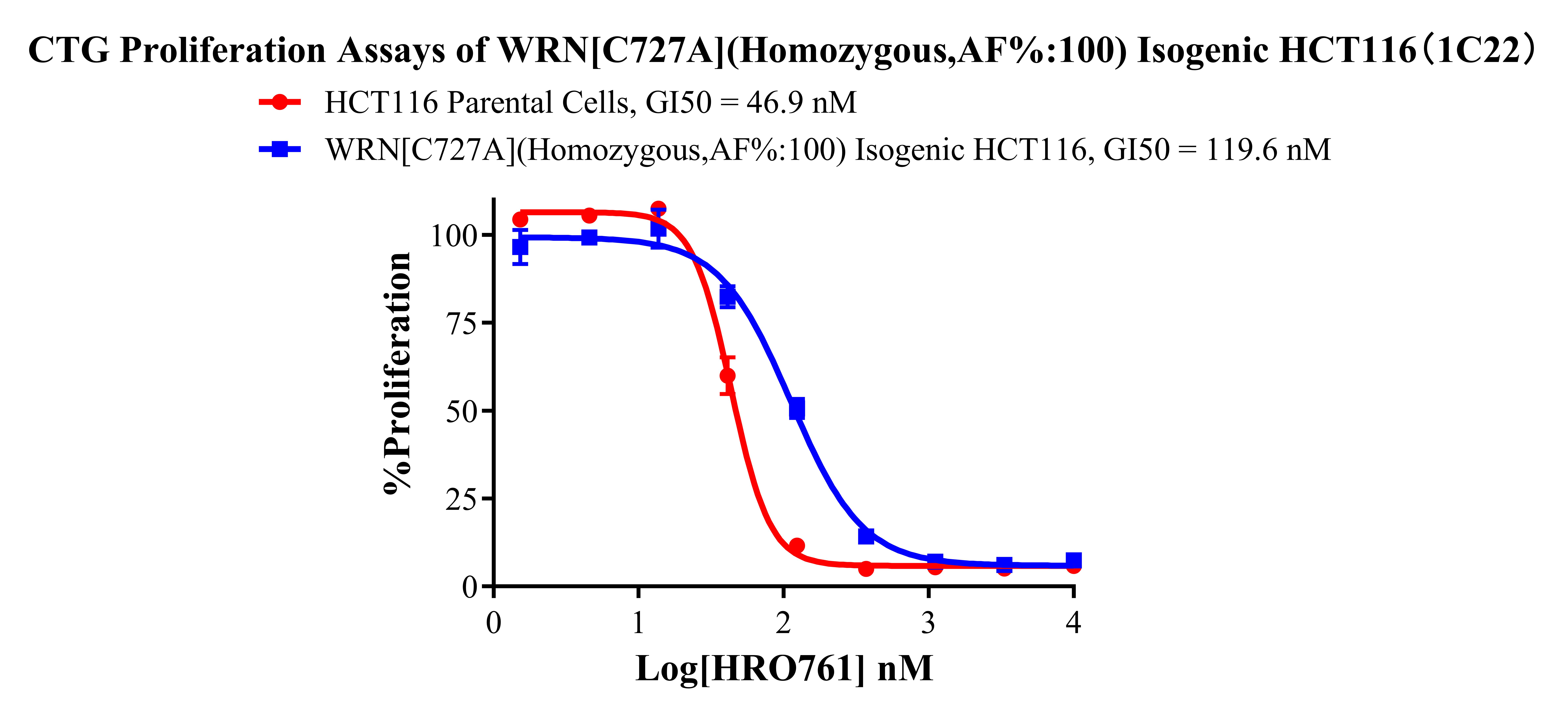 ![]() Figure 2. Sanger of WRN[C727A](Homozygous,AF%:100) Isogenic HCT116 ![]() Figure 3. A:HCT116 Parental Cell;B:WRN[C727A](Homozygous,AF%:100) Isogenic HCT116 通道2 藍色微滴代表WRN[C727A]突變陽性,通道2 綠色微滴代表該位點為陰性野生型 ![]() Figure 4. CTG Proliferation Assays of WRN[C727A](Homozygous,AF%:100) Isogenic HCT116(1C22). ![]() Figure 5. CTG Proliferation Assays of WRN[C727A](Homozygous,AF%:100) Isogenic HCT116(1C22). |