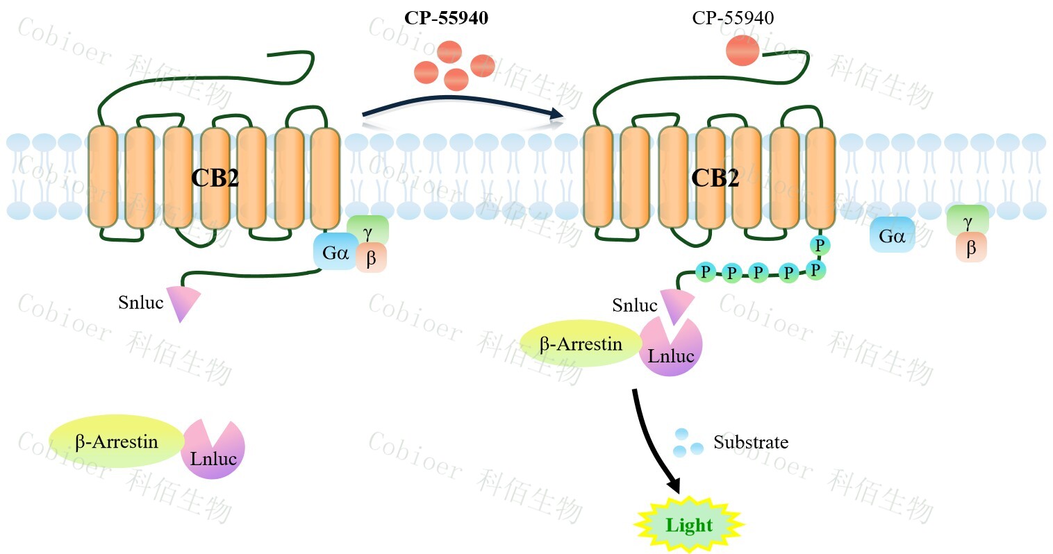 CB2 β-Arrestin CHO 報告基因藥靶模型很好的模擬了體內(nèi) CB2/β-Arrestin 的信號轉(zhuǎn)導(dǎo)過程,原理見下圖所示。當缺乏配體刺激時,β-Arrestin 不與 CB2 結(jié)合,融合β-Arrestin 的熒 光素酶處于失活構(gòu)象,當 CB2 遭遇配體刺激時,融合熒光素酶報告基因的β-Arrestin 被招 募,使熒光素酶報告基因處于激活狀態(tài),加入其底物后發(fā)光信號增強。![]() Figure 1. CB2 β-Arrestin CHO 細胞模型原理圖 |