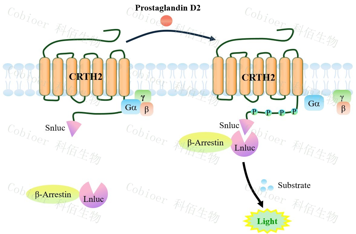 CRTH2(DP2) β-Arrestin CHO 報告基因藥靶模型很好的模擬了體內 CRTH2(DP2)/β- Arrestin 的信號轉導過程, 原理見下圖所示。 當缺乏配體刺激時 , β-Arrestin 不與 CRTH2(DP2)結合,融合β-Arrestin 的熒光素酶處于失活構象,當 CRTH2(DP2)遭遇配體刺 激時,融合熒光素酶報告基因的β-Arrestin 被招募,使熒光素酶報告基因處于激活狀態(tài),加 入其底物后發(fā)光信號增強。![]() Figure 1. CRTH2(DP2) β-Arrestin CHO 細胞模型原理圖 |