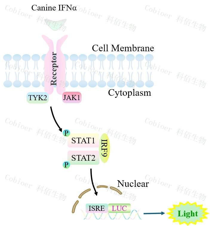 Canine IFNα&β Effector Reporter Cell 報(bào)告基因細(xì)胞,是由調(diào)控因子調(diào)控 并表達(dá) Luc 熒光素酶報(bào)告基因的重組細(xì)胞。IFNα與受體結(jié)合,激活 ISRE 的原理見(jiàn)下圖所示。![]() Figure 1. Canine IFNα&β Effector Reporter Cell 細(xì)胞模型原理圖 |