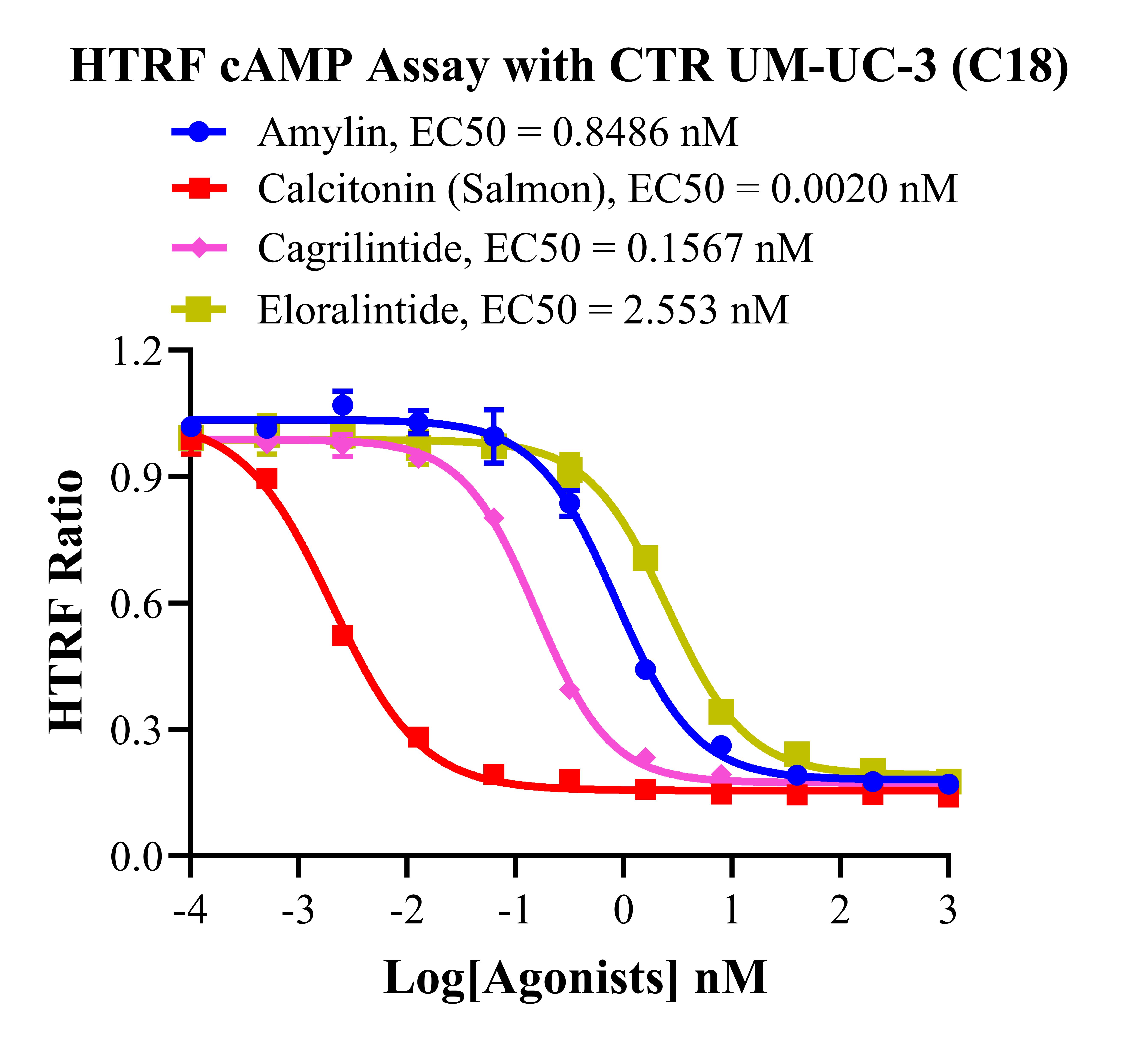 | 降鈣素基因相關(guān)肽(CGRP)家族包括 CGRP 本身、降鈣素(CT)、腎上腺髓質(zhì)素 (AM)和胰島淀粉樣肽(AMY)。 胰淀素(Amylin)受體的三種類型的已被確定,即 AMY1,AMY2 和 AMY3。胰淀素 受體屬于 B 類 GPCR,是異二聚體復(fù)合物,由降鈣素受體(CTR)與受體活性修飾蛋白 (RAMPs)結(jié)合形成。該受體的 CTR 組分具有相同的 GPCR 結(jié)構(gòu):7 個(gè)跨膜相互連接的α- 螺旋,將細(xì)胞外信號(hào)傳遞到細(xì)胞內(nèi)細(xì)胞質(zhì)信號(hào)級(jí)聯(lián)。RAMP 有三種類型(RAMP1、 RAMP2 和 RAMP3),它們共享 31%的氨基酸序列,具有相似的基本結(jié)構(gòu)。RAMP 是將 CTR 轉(zhuǎn)運(yùn)到細(xì)胞膜并調(diào)節(jié)其配體特異性的重要肽,它可以改變特定 GPCR 的藥理學(xué)、功能 和細(xì)胞運(yùn)輸。 哺乳動(dòng)物細(xì)胞中 Amylin 受體的激活已被證明可以提高 cAMP,并被認(rèn)為與 Gs 蛋白和 腺苷酸環(huán)化酶的刺激有關(guān)。在 RAMPs 的存在下,其與胰淀素的結(jié)合親和力可以被修飾。 CTR 和 RAMP1 或 CTR 和 RAMP3 的異質(zhì)結(jié)構(gòu)被認(rèn)為有利于與胰淀素結(jié)合,介導(dǎo)大腦中的 生理功能。AMY3 的激活刺激 G 蛋白 Gαs,進(jìn)一步控制腺苷酸環(huán)化酶(AC),隨后增加細(xì) 胞 cAMP。cAMP 與 PKA 調(diào)控亞基(R2)的結(jié)合誘導(dǎo) PKA 四聚體全酶解離,導(dǎo)致 PKA 催 化亞基的激活。cAMP 激活的 PKA 參與調(diào)控 ERK1/2 的活性。ERK1/2 通路的觸發(fā)可能導(dǎo)致 Ca 2+分布不均勻,引發(fā)內(nèi)質(zhì)網(wǎng)和線粒體功能障礙,導(dǎo)致細(xì)胞死亡。此外,cAMP 刺激 AKT 進(jìn)一步導(dǎo)致轉(zhuǎn)錄因子 cFos 的表達(dá)。 |