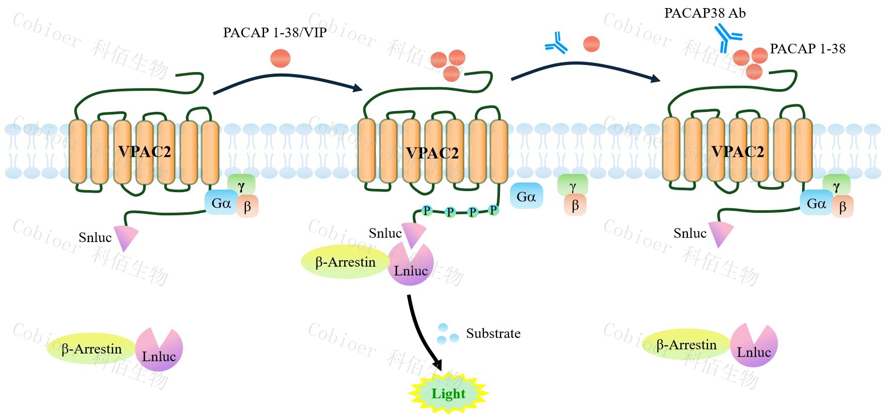 VPAC2 β-Arrestin CHO 報告基因藥靶模型很好的模擬了體內(nèi) VPAC2/β-Arrestin 的信號轉(zhuǎn)導(dǎo)過程,原理見下圖所示。當(dāng)缺乏配體刺激時,β-Arrestin 不與 VPAC2 結(jié)合,融合β- Arrestin 的熒光素酶處于失活構(gòu)象,當(dāng) VPAC2 遭遇配體刺激時,融合熒光素酶報告基因的 β-Arrestin 被招募,使熒光素酶報告基因處于激活狀態(tài),加入其底物后發(fā)光信號增強(qiáng)。![]() Figure 1. VPAC2 β-Arrestin CHO 細(xì)胞模型原理圖 |