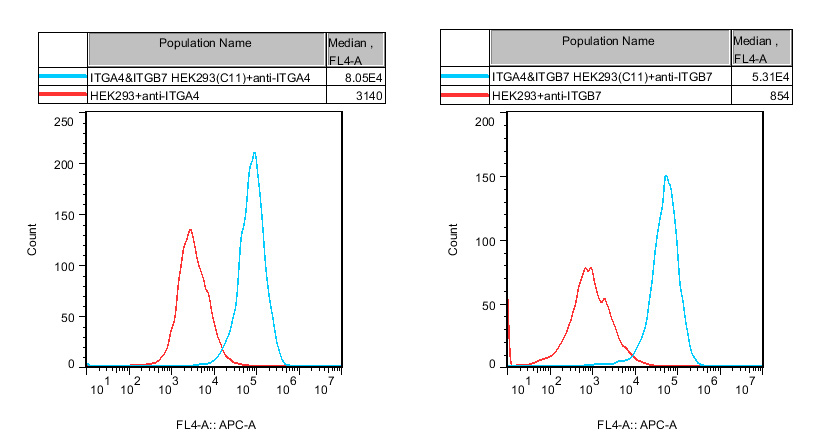 ![]() Figure 1. Recombinant ITGA4&ITGB7 HEK293 stably expressing ITGA4&ITGB7.