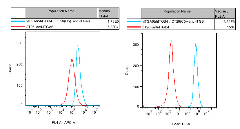 IV. Representative Data![]() Figure 1. Recombinant hITGA6&hITGB4/CT26 stably expressing ITGA6&ITGB4. |
