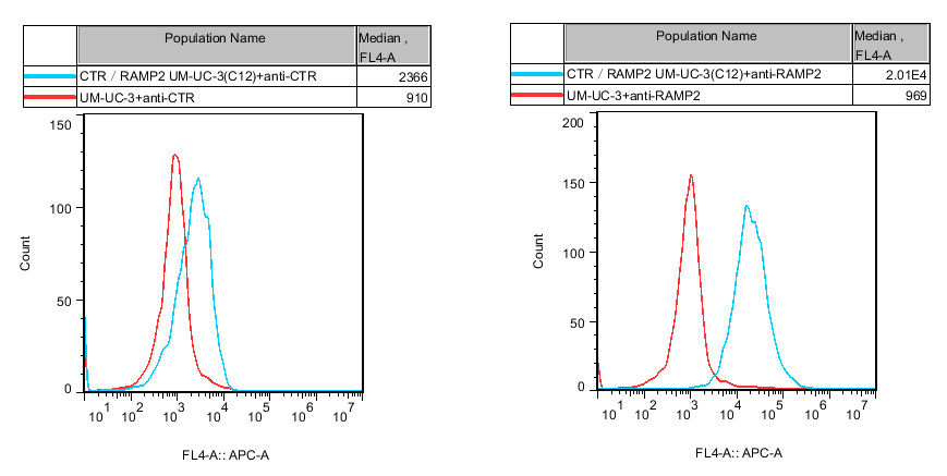 CTR&RAMP2 UM-UC-3 細(xì)胞藥靶模型很好的模擬了體內(nèi) CTR&RAMP2 的信號轉(zhuǎn)導(dǎo)過程,原理見下圖所示。![]() Figure 1. CTR&RAMP2 UM-UC-3 細(xì)胞流式驗(yàn)證 CTR 和 RAMP2 的表達(dá) |
