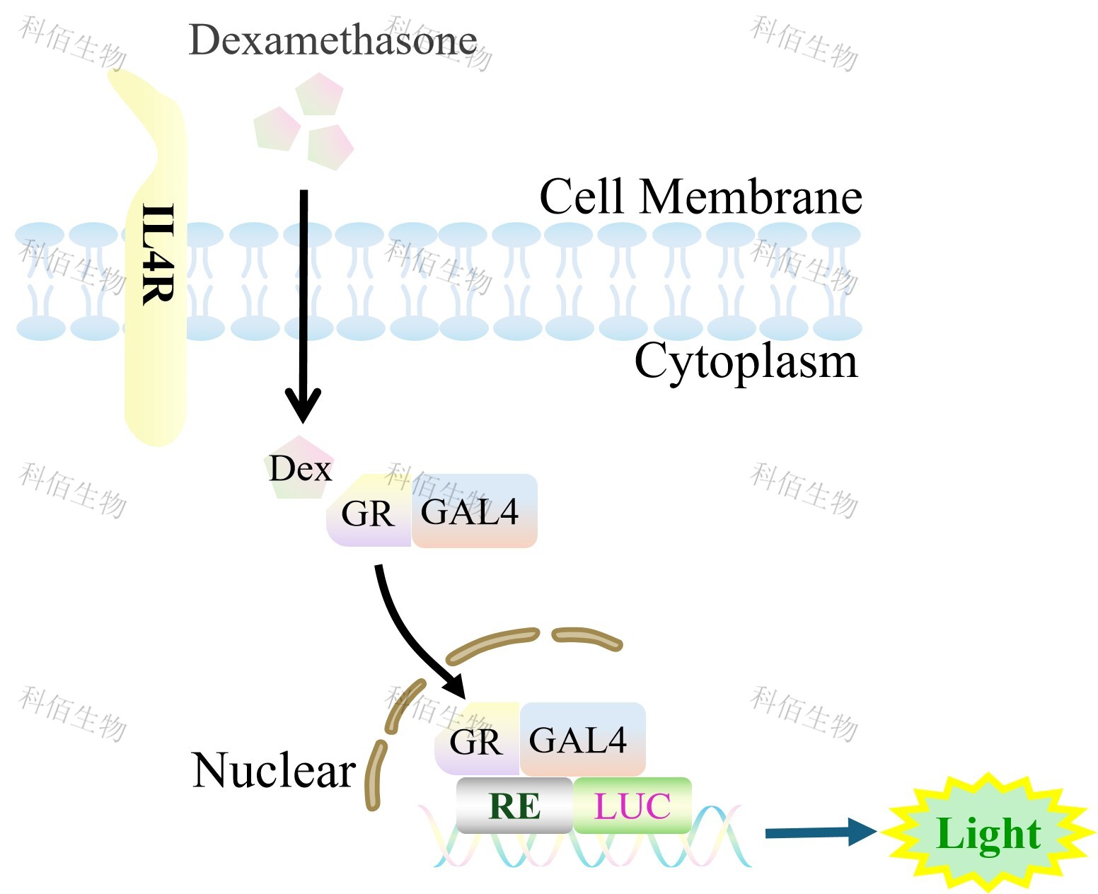 IL4R(High expression)&GR-GAL4 Luciferase Reporter HEK293 報(bào)告基因細(xì)胞,是在 GR-GAL4 Luciferase Reporter HEK293 重組細(xì)胞上過(guò)表達(dá)人的 IL4R。Dexamethasone (Hexadecadrol,地塞米松)是糖皮質(zhì)激素受體 (Glucocorticoid Receptor)激動(dòng)劑、凋亡誘導(dǎo)劑,原理見(jiàn)下圖所示。![]() Figure 1. IL4R(High expression)&GR-GAL4 Luciferase Reporter HEK293 細(xì)胞原理示意圖 |
