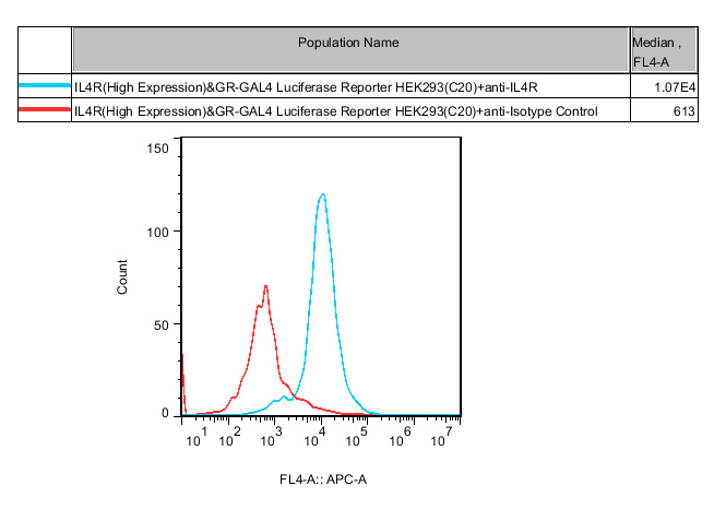![]() Figure 2. Recombinant IL4R( High expression)&GR-GAL4 Luciferase Reporter HEK293 stably expressing IL4R. ![]() |
