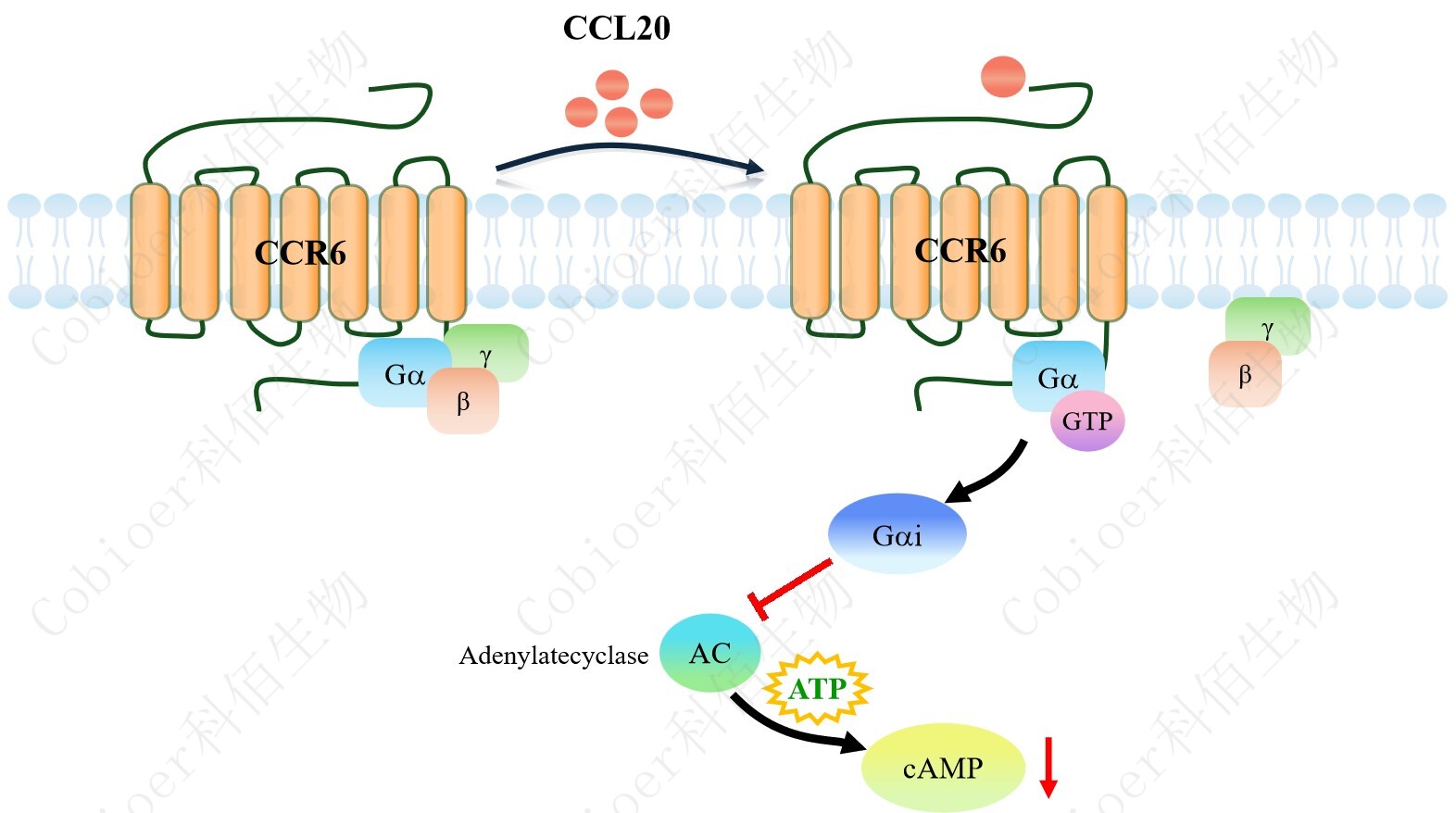 cAMP 在 G 蛋白偶聯(lián)受體(GPCR)信號(hào)轉(zhuǎn)導(dǎo)中是一種關(guān)鍵的第二信使。當(dāng)配體結(jié)合到 GPCR,構(gòu)象發(fā)生變化,激活受體接著激活 G 蛋白,Gi 的激活導(dǎo)致腺苷酸環(huán)化酶調(diào)控 cAMP 的下調(diào)。CCR6 藥靶模型很好的模擬了體內(nèi) CCR6 的信號(hào)轉(zhuǎn)導(dǎo)過(guò)程,原理見(jiàn)下圖所示。![]() Figure 1. CCR6 CHO 細(xì)胞模型原理圖 |