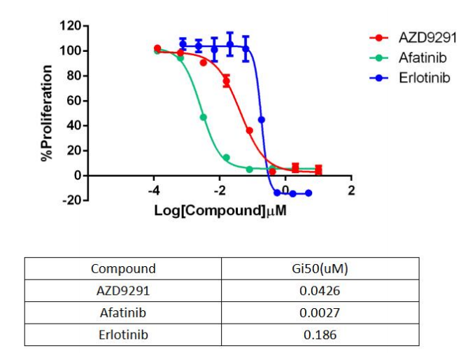 Figure 2. Anti-proliferation assay of three reference compounds on the EGFR WT (EGF Dependent)/BaF3 Stable Cell Line. |