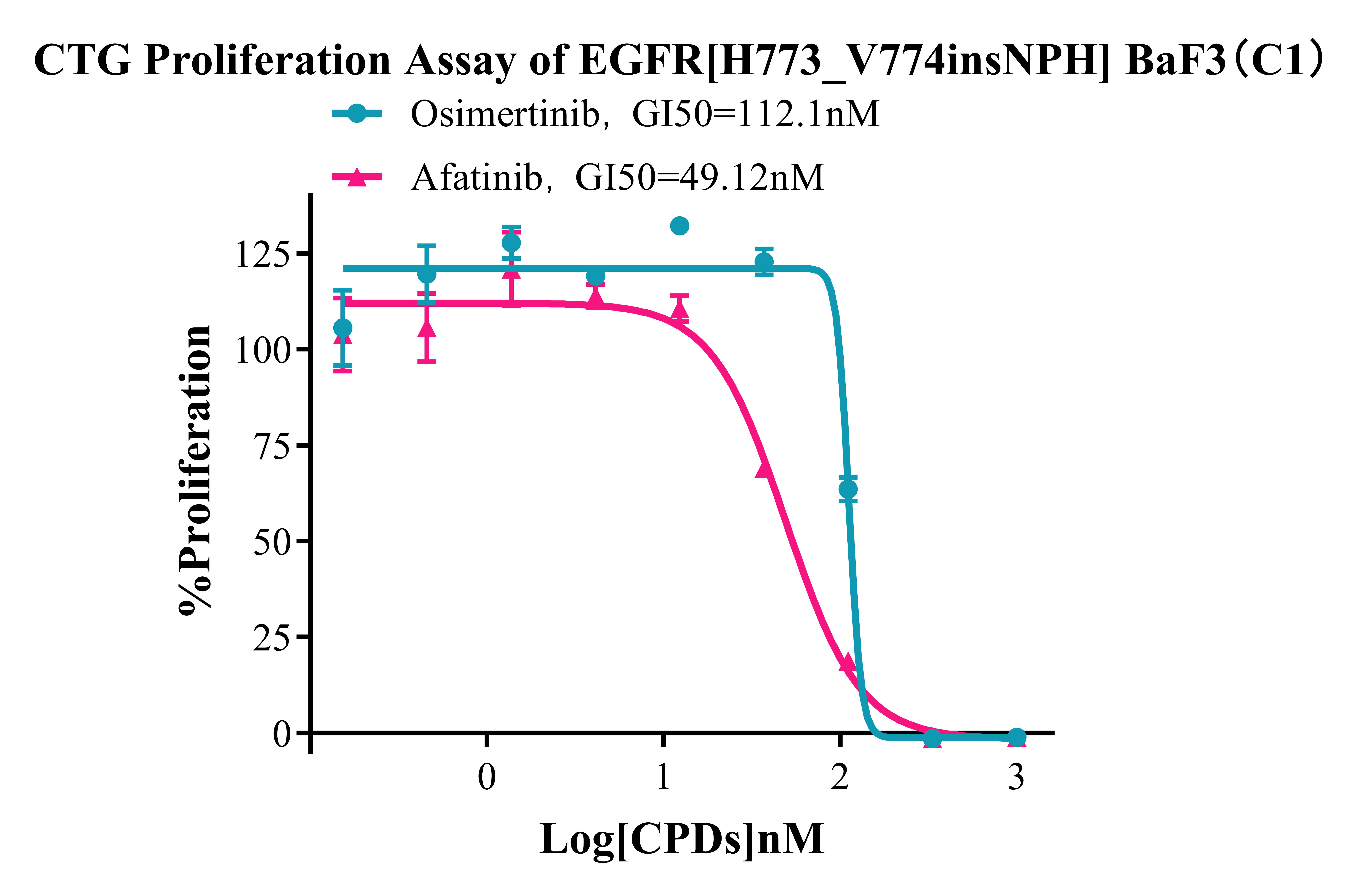 BaF3(小鼠原 B 細胞)的生長和增殖需要 IL-3 的維持。通過引入各種表達激酶的基因, 能作為 BaF3 的驅(qū)動基因,讓 BaF3 不再依賴 IL-3 而增殖,進而激酶基因成為 BaF3 增殖依 賴的驅(qū)動基因,用于評估小分子藥物對激酶的靶向抑制作用,原理及流程見下圖所示。![]() Figure 1. EGFR[H773_V774insNPH] BaF3 細胞的構(gòu)建原理圖 |