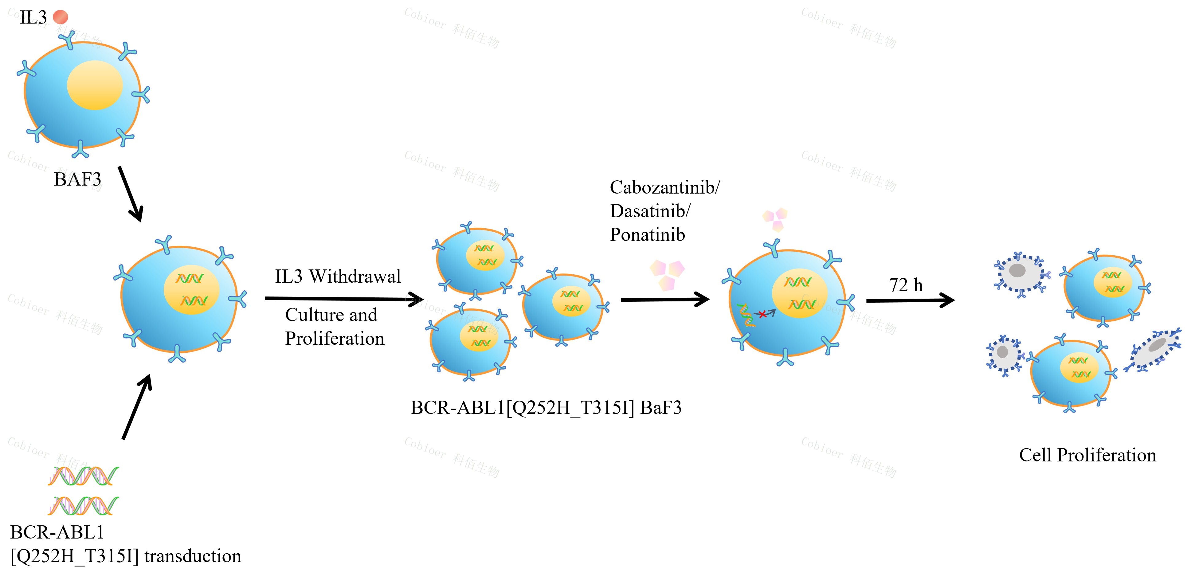 BaF3(小鼠原 B 細(xì)胞)的生長和增殖需要 IL-3 的維持。通過引入各種表達(dá)激酶的基因, 能作為 BaF3 的驅(qū)動基因,讓 BaF3 不再依賴 IL-3 而增殖,進(jìn)而激酶基因成為 BaF3 增殖依賴的驅(qū)動基因,用于評估小分子藥物對激酶的靶向抑制作用,原理及流程見下圖所示。