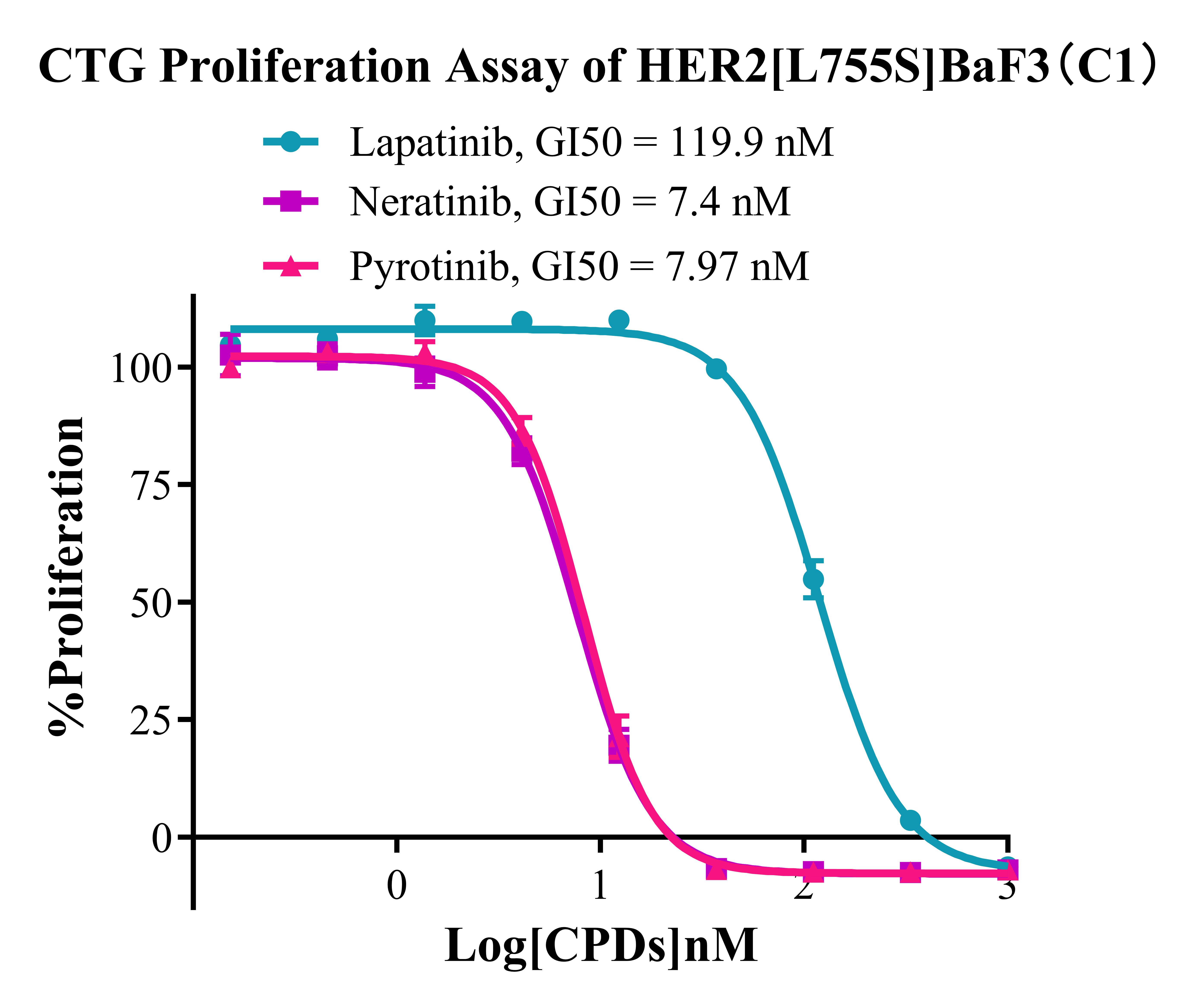 HER2[L755S] BaF3 藥靶細(xì)胞,通過轉(zhuǎn)導(dǎo)突變狀態(tài)的 Her2[L755S] 基因 到 BaF3 細(xì)胞系中,穩(wěn)定表達(dá)人突變形態(tài)下的 Her2[L755S] 基因。