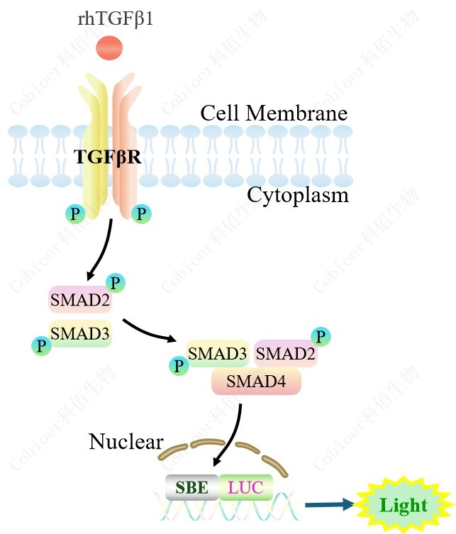 SBE-Luc HEK293 報告基因細胞,是由 SBE 調(diào)控并表達 Luc 熒光素酶報 告基因的 HEK293 細胞。TGF-β與受體結(jié)合,激活 SBE 的原理見下圖所示。![]() Figure 1. SRE-Luc HEK293 細胞模型原理圖 |