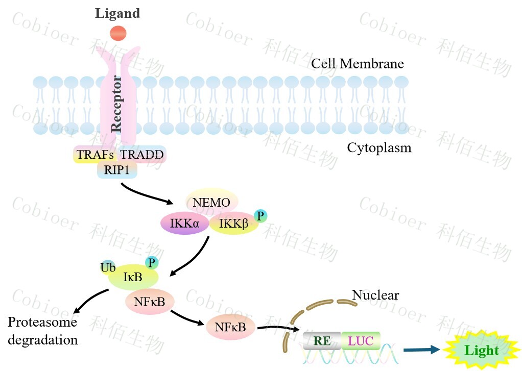 NFκB-Luc HEK293 報告基因細(xì)胞,是由 NFκB 調(diào)控并表達 Luc 熒光素酶 報告基因的 HEK293 細(xì)胞。配體與受體結(jié)合后,激活 NF-κB 的原理見下圖所示。![]() Figure 1:NFκB-Luc HEK293 細(xì)胞模型原理圖 |