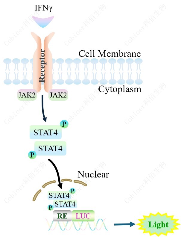 STAT4-Luc HEK293 報告基因細胞,是由 STAT4 調(diào)控并表達 Luc 熒光素 酶報告基因的 HEK293 細胞。IFNγ與受體結(jié)合,激活 STAT4 的原理見下圖所示。