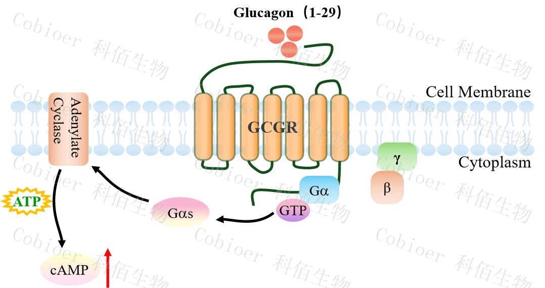 | 胰高血糖素是一種胰腺肽激素,作為胰島素的反調(diào)節(jié)激素,刺激葡萄糖通過(guò)肝臟釋放, 維持葡萄糖穩(wěn)態(tài)。GCGR 是一種 B 類 GPCR,最初被描述為與腺苷酸環(huán)化酶功能相連的胰 高血糖素結(jié)合體。它在維持葡萄糖穩(wěn)態(tài)中起關(guān)鍵作用,因此被認(rèn)為是治療糖尿病的一個(gè)有 價(jià)值的靶點(diǎn)。 GCGR 的天然配體是胰高血糖素。胰高血糖素與受體結(jié)合激活 Gs 蛋白,從而激活腺苷 酸環(huán)化酶。GCGR 受體與天然配體胰高血糖素結(jié)合調(diào)節(jié)體內(nèi)葡萄糖穩(wěn)態(tài),是Ⅱ型糖尿病的 重要藥物靶點(diǎn)。 |