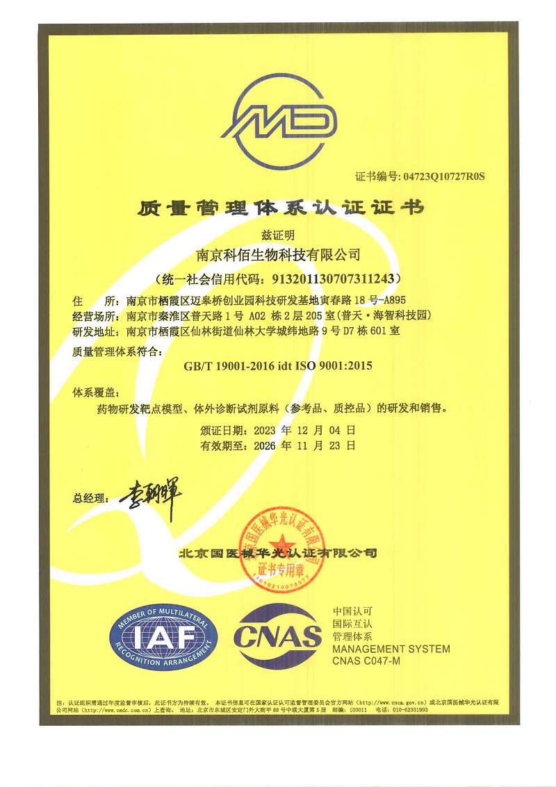 ISO 9001:2015 認(rèn)證范圍:藥物研發(fā)靶點模型、體外診斷試劑原料(參考品、質(zhì)控品) 的研發(fā)和銷售。